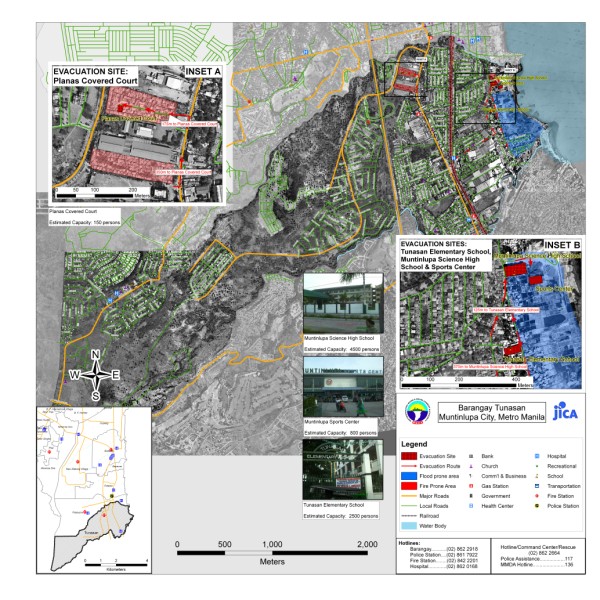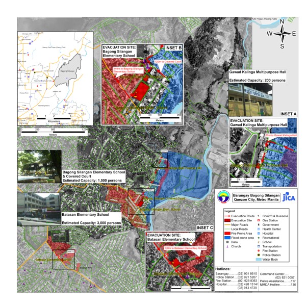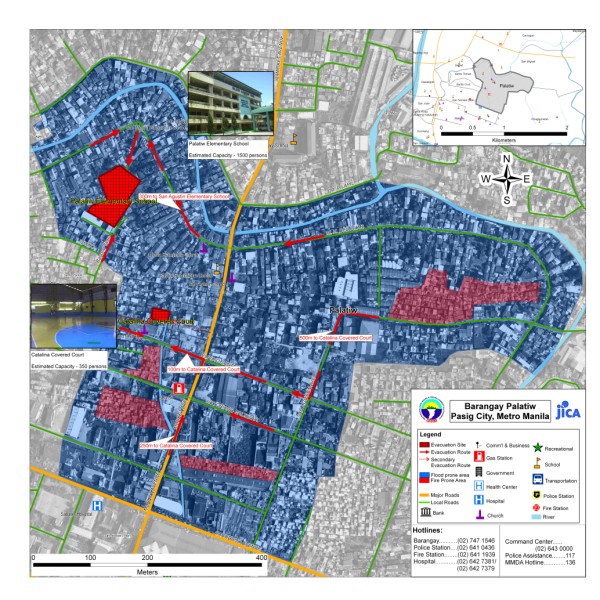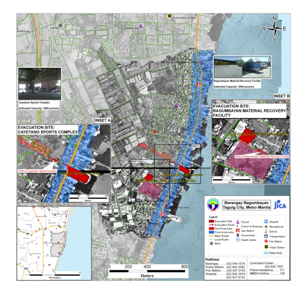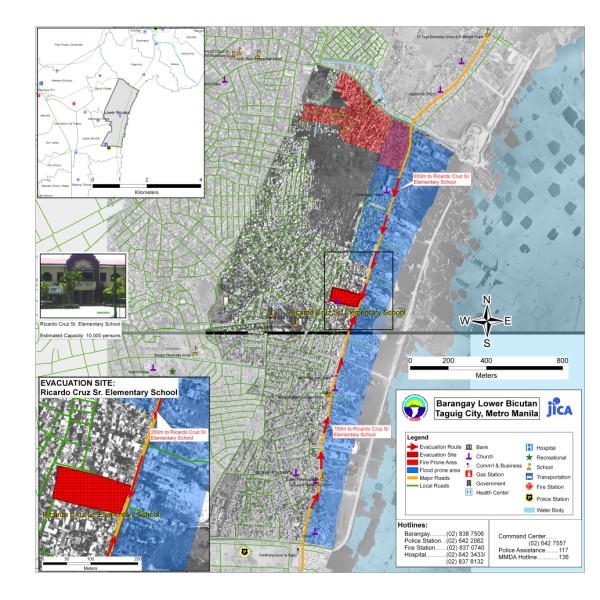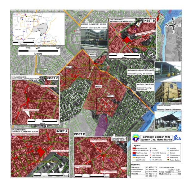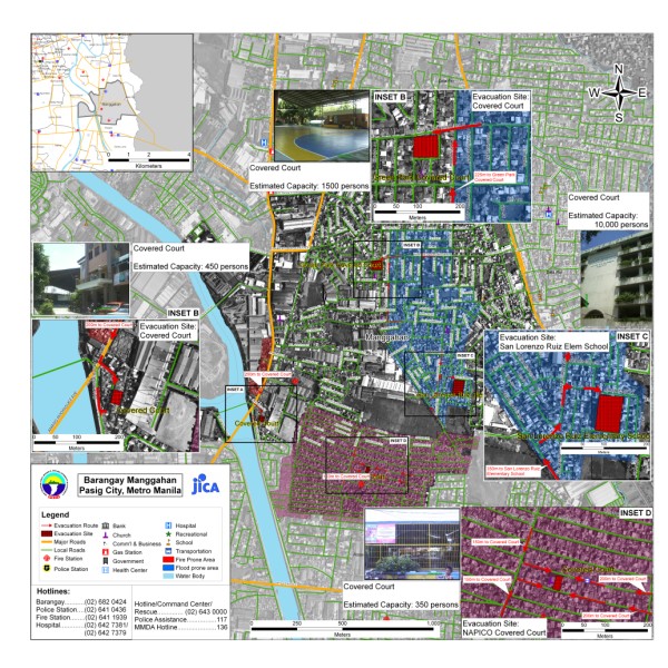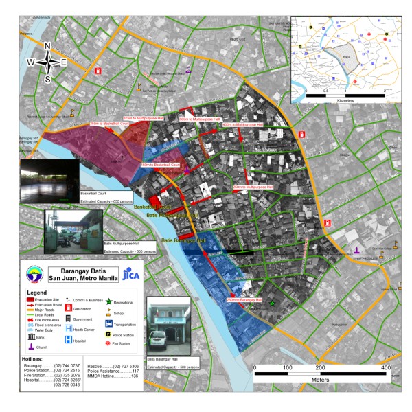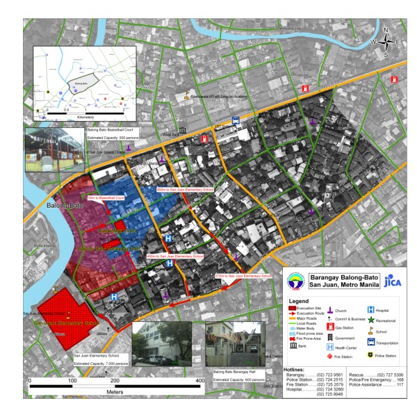 The project aims to produce community level evacuation maps for vulnerable barangays in Metro Manila facing multiple hazards such flood, earthquake and fire. Aside from the preparation of GIS-based Barangay Disaster Evacuation Area Maps, SRDP participated in public awareness activities and consultation on Disaster Evacuation Areas. Barangay-wide GIS data were also updated through selective ground and structure surveys using Global Positioning System (GPS) equipment and other mapping tools. Sample Outputs: |